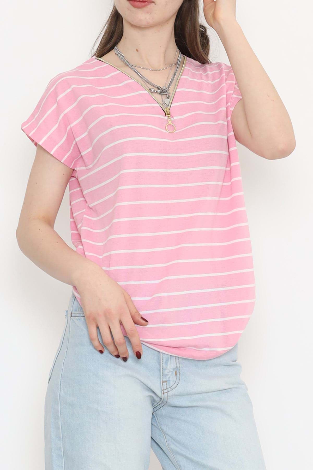 Fermuarlı Çizgili Tişört Pembe - 9657.1567.