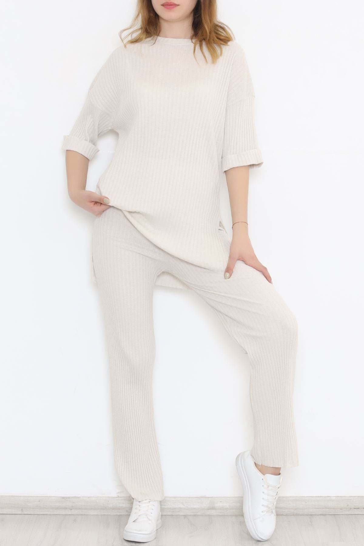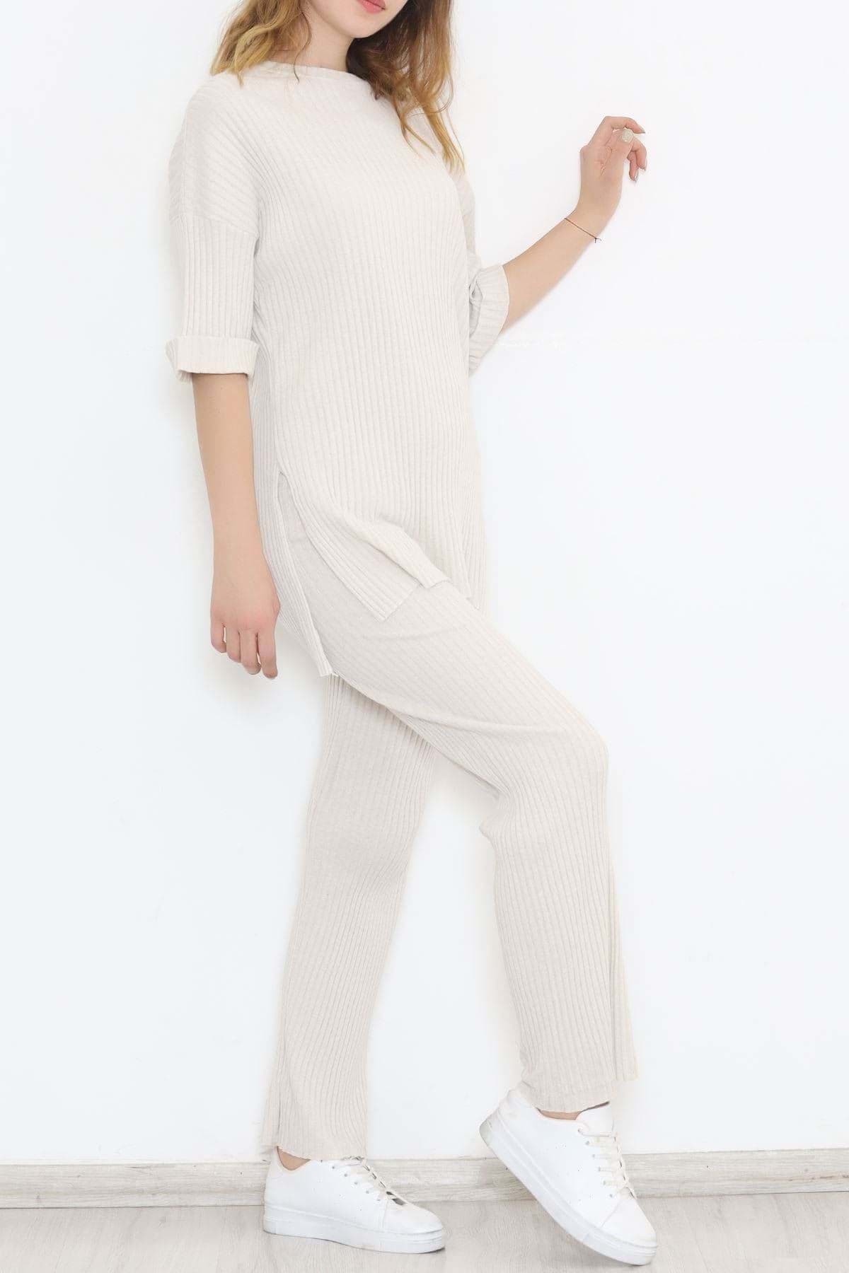 • AçıklamaÜrün Özellikleri;   Üst Boy: 79 cm. Alt Boy: 102 cm. Alt Bel Genişliği: 35 cm. Alt İç Bacak Boyu: 69 xx. Alt Bel Yüksekliği: 32 cm. Alt Basen Genişliği: 47 cm. Kalıp: Salaş Kumaş: Kaşkorse Özellik: Üst iki yandan yırtmaçlı Aksesuar: - Likra: Yok