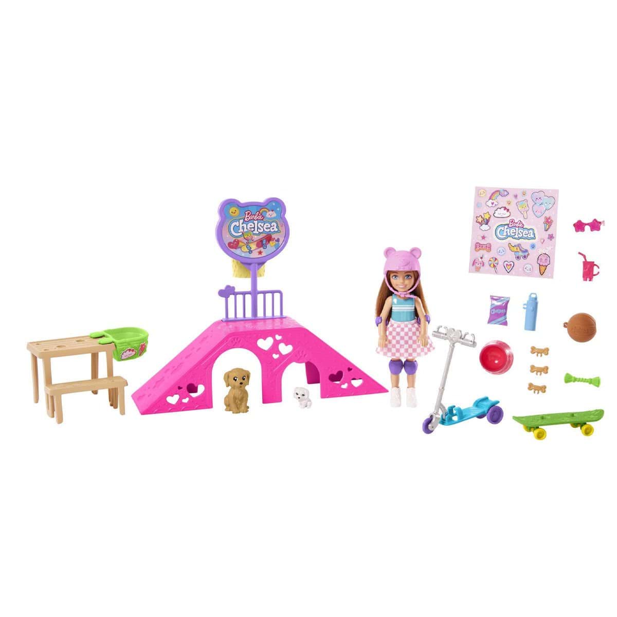 Kutu içerisinde; Çıkarılabilir bir etek, ayakkabı, kask, dirsek ve diz koruyucularıyla 1 Chelsea™ bebek, 2 yavru köpek, 1 kaykay rampası, 1 basketbol potası, 1 basketbol topu, 1 piknik masası, 1 bank ve 1 klipsli köpek koltuğu, 1 scooter ve 1 kaykay, 9 aksesuar ve 1 çıkartma sayfası dahildir.