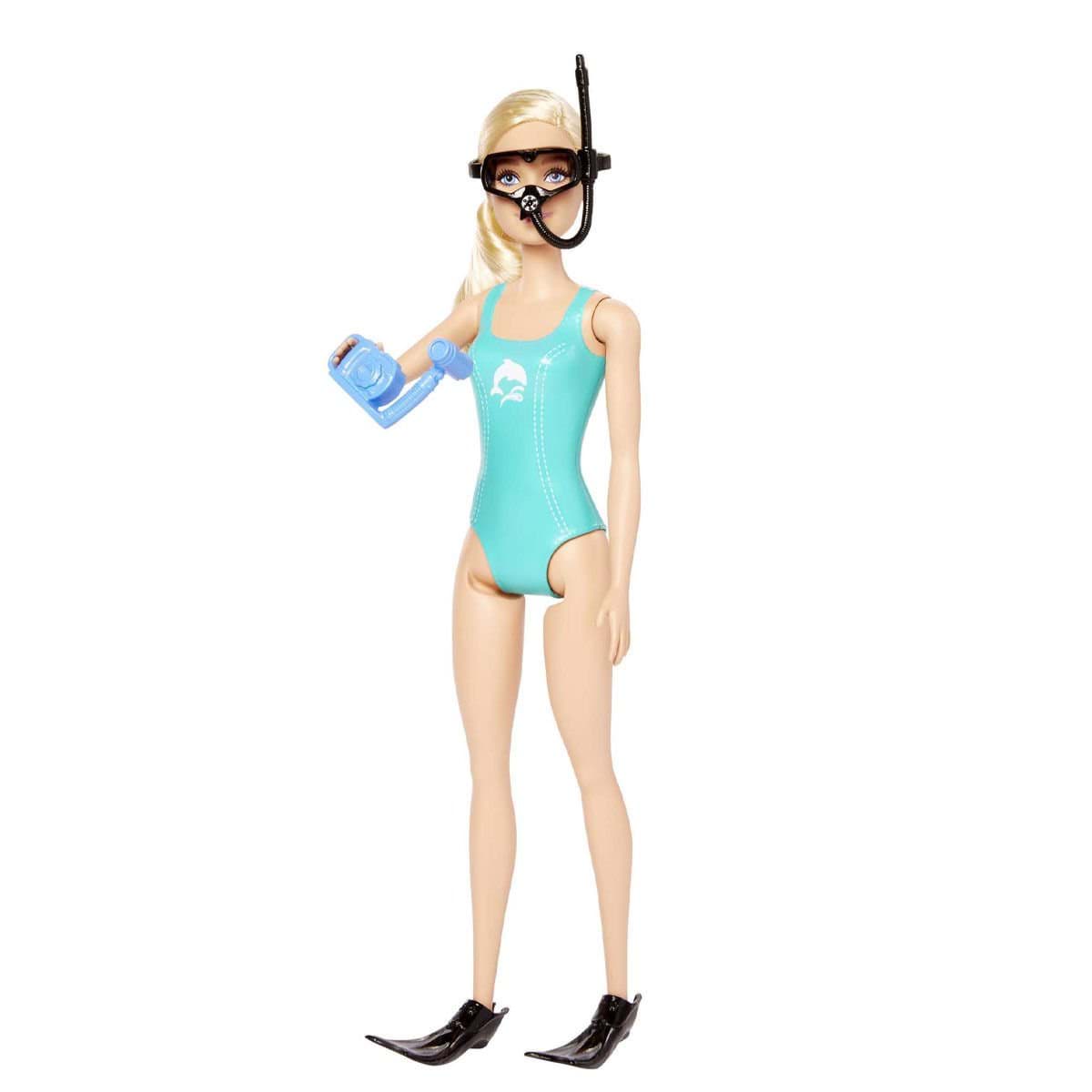 Şnorkel takımı, deniz yaşamı (yunus gibi!) ve laboratuvar ekipmanlarıyla Barbie® bebek, çocukları su altı macerasına çıkarıyor.