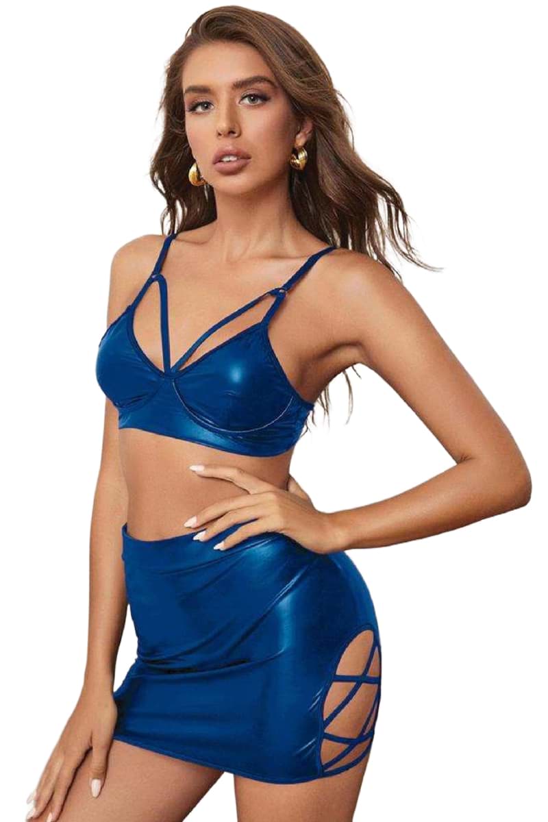 Kadın Fantezi Deri Kostüm Harness Erotik Kıyafet D21053 Mavi