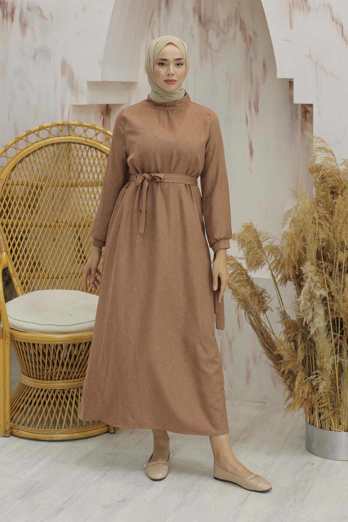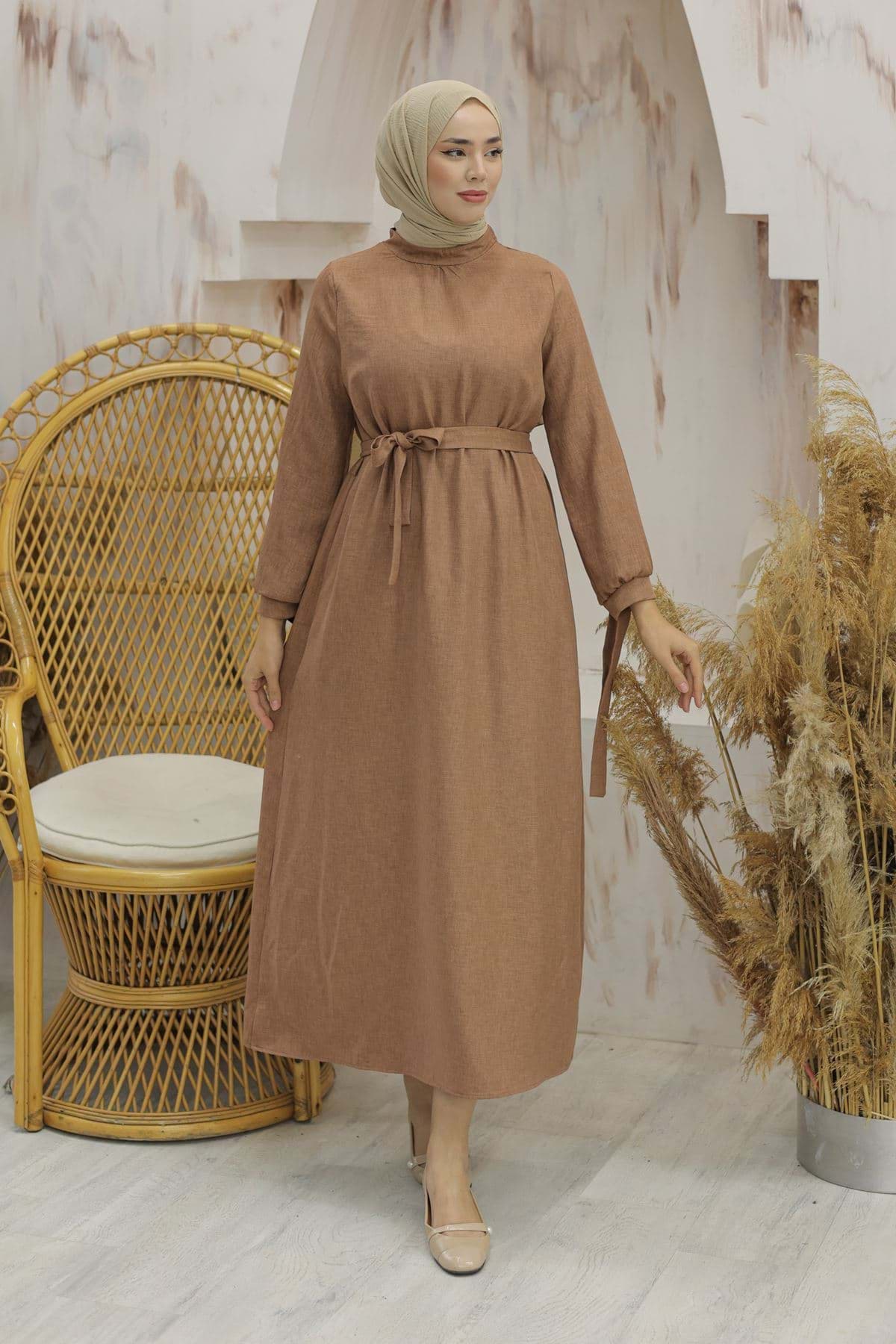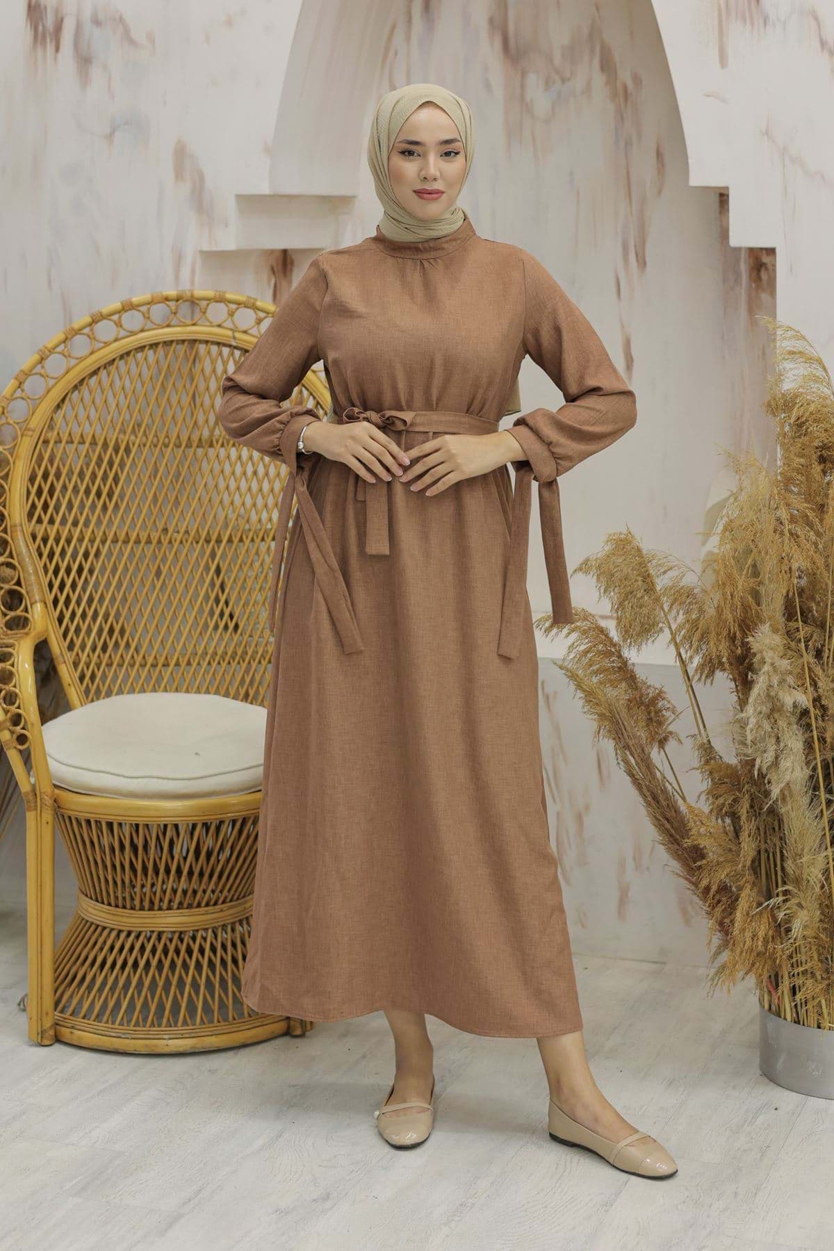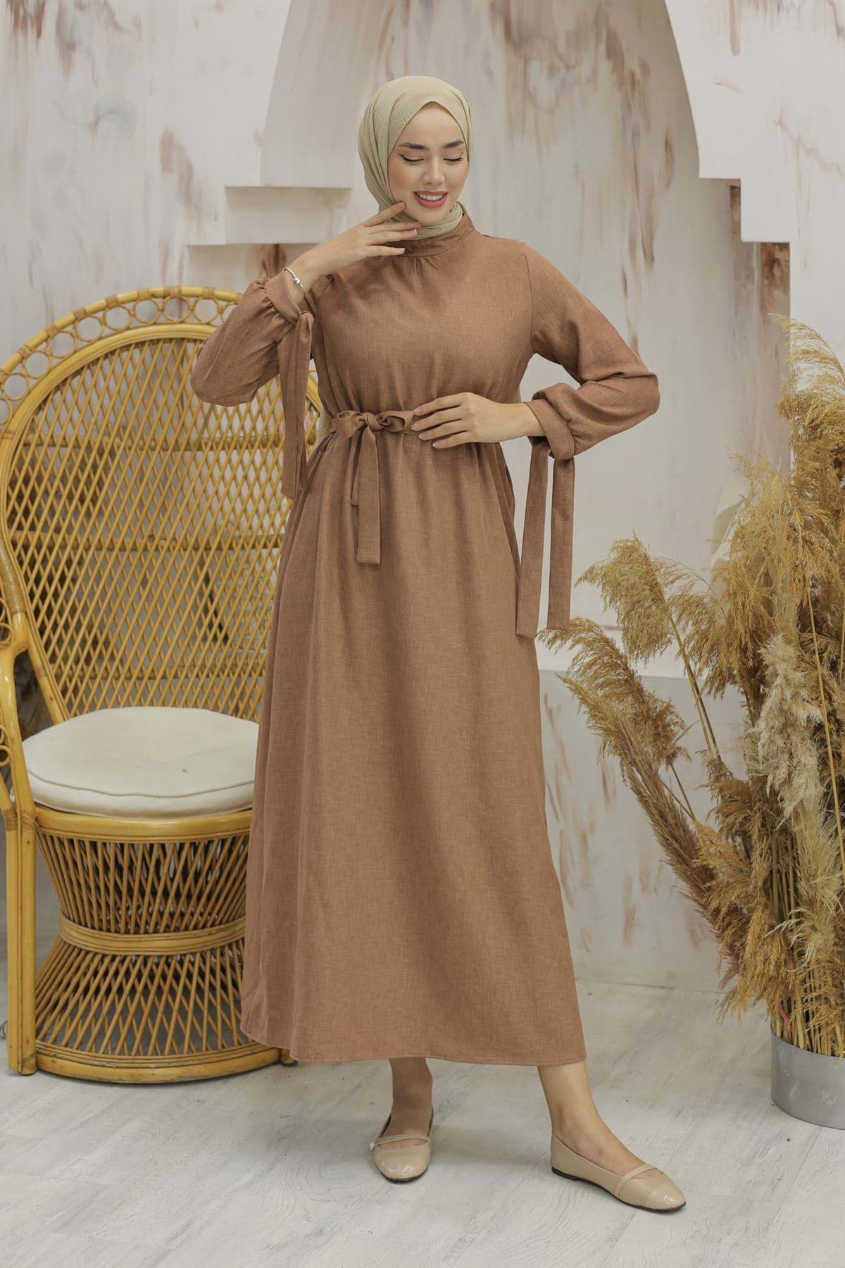 Kol Bağcıklı Keten Elbise Kahve - 20346.1778. resmi
