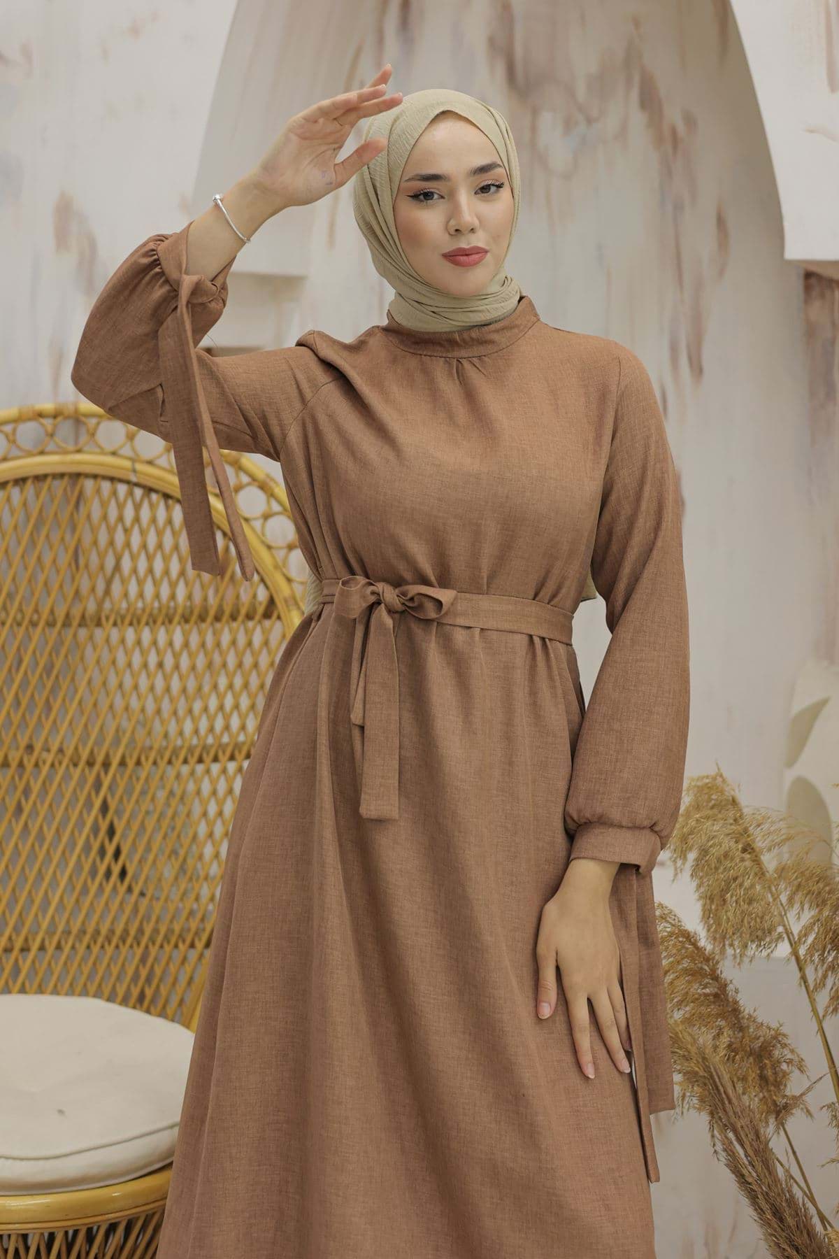 Kol Bağcıklı Keten Elbise Kahve - 20346.1778.