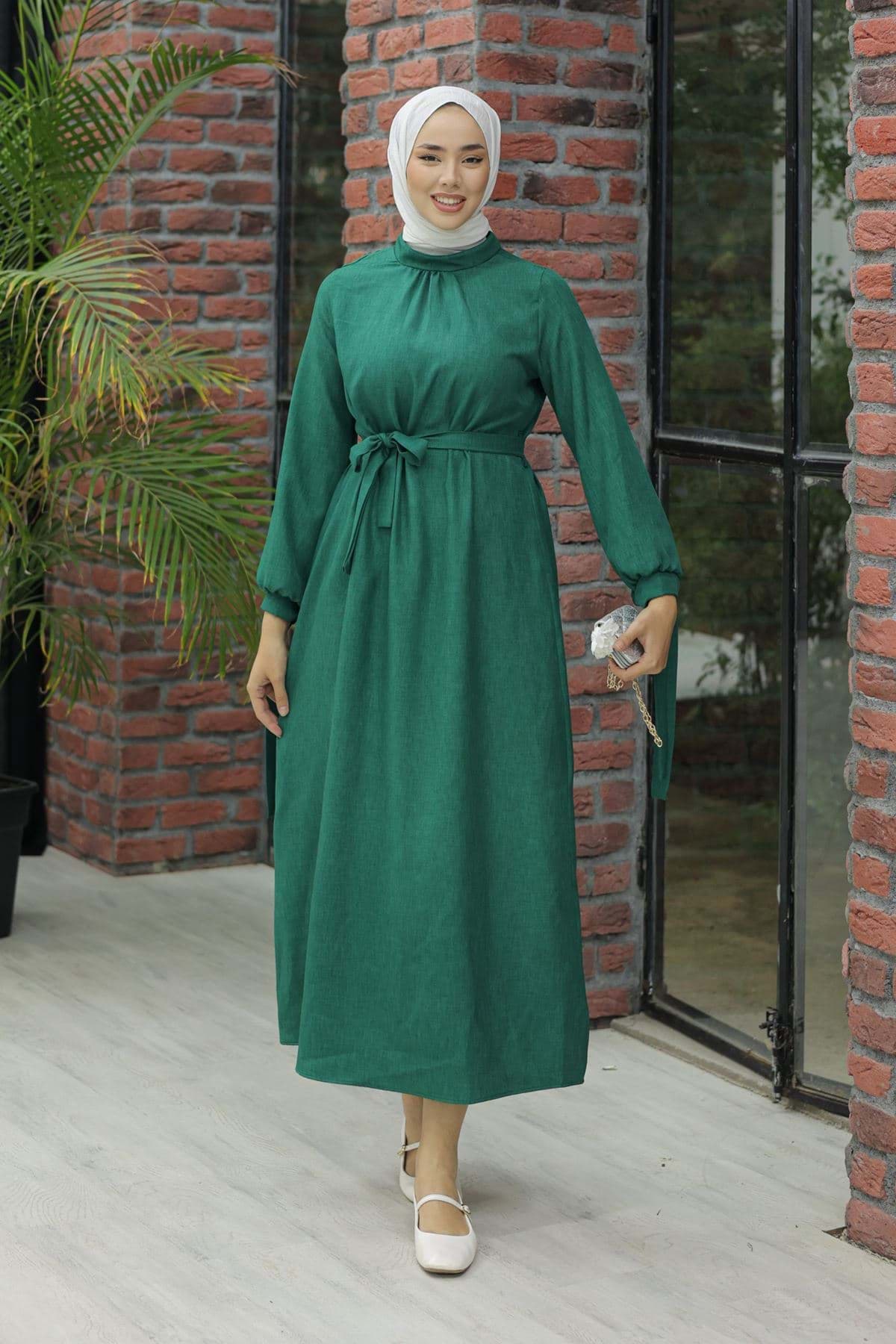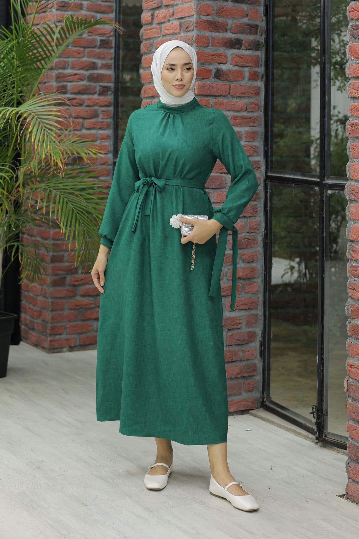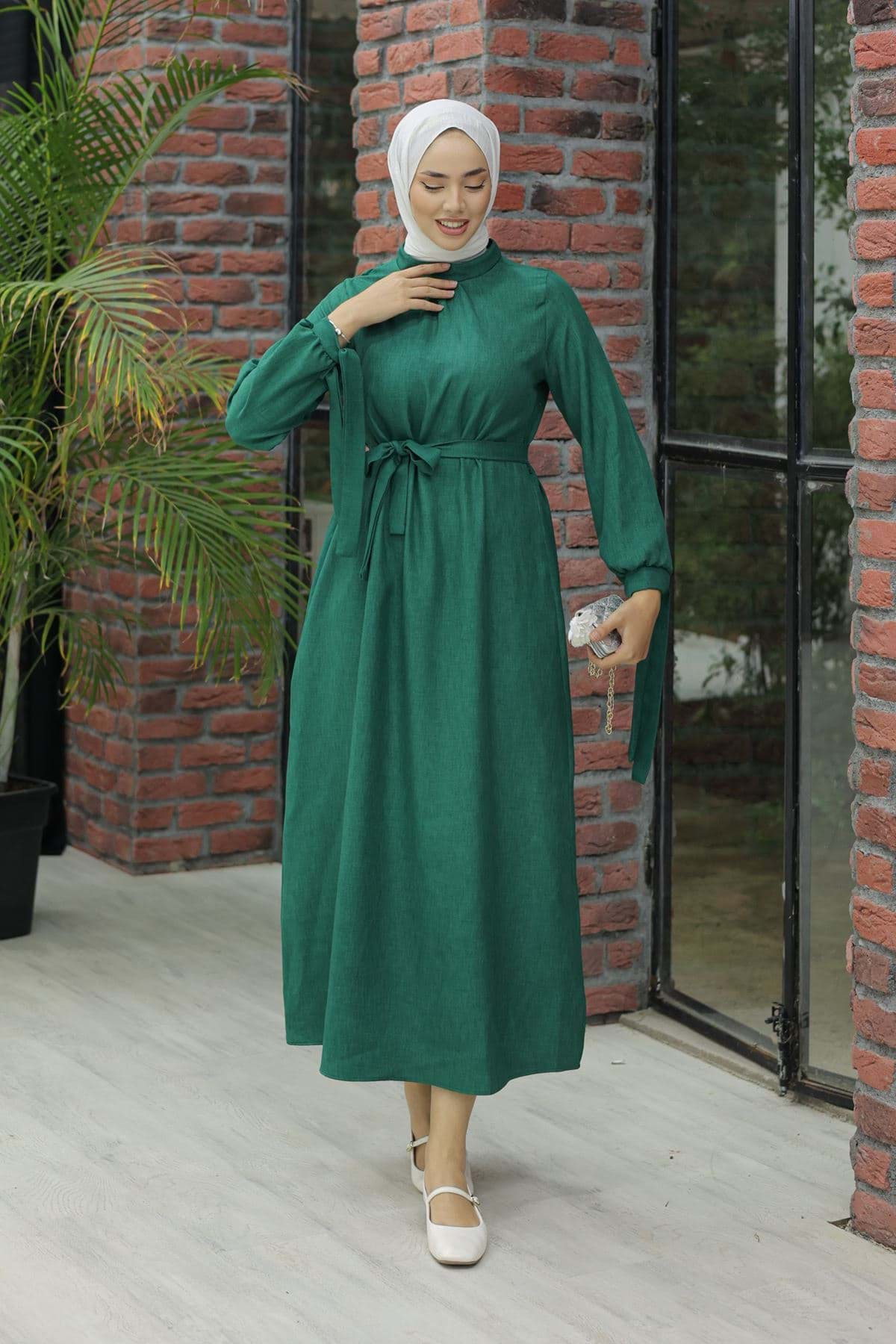 Kol Bağcıklı Keten Elbise Yeşil - 20346.1778. resmi