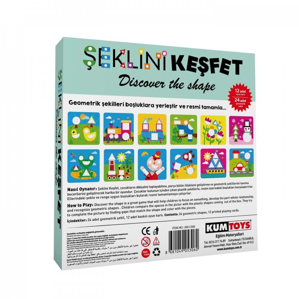 Kumtoys Şeklini Keşfet kutusunda 22 adet geometrik şekil, 12 adet baskılı oyun kartı ve 2 parça oyun tablası bulunur.
